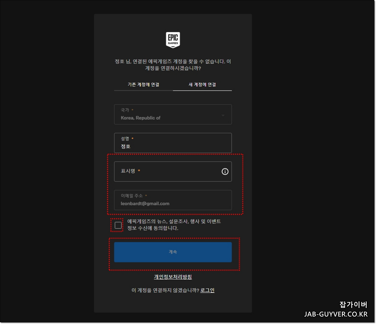 이후 사용할 닉네임과 이메일주소를 확인 후 가입을 완료합니다.