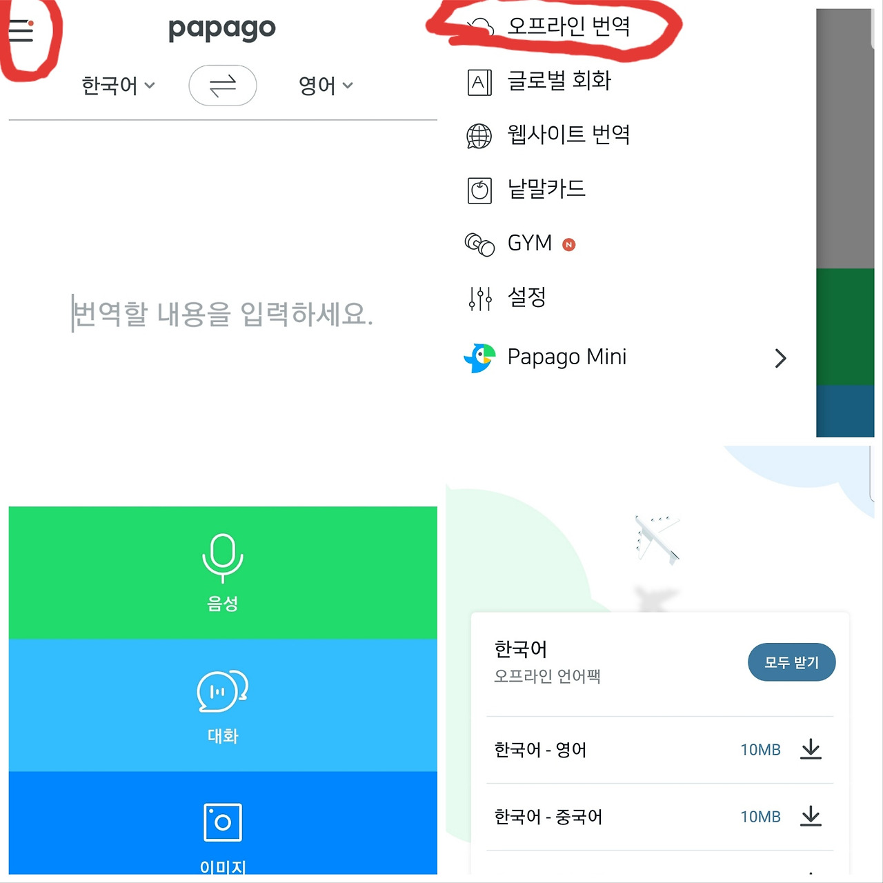 파파고 앱 왼쪽 상단에 세줄 버튼을 클릭하여 “오프라인 번역”을 클릭하세요. 원하는 언어팩을 다운로드하면 인터넷 연결 없이도 파파고를 사용할 수 있습니다.