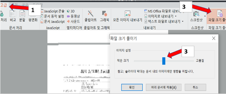 불어온 후 “고급” 메뉴에서 리본 메뉴로 열리는 맨 끝의 “파일 크기 줄이기”라는 메뉴를 클릭하면 새로운 창이 뜹니다.