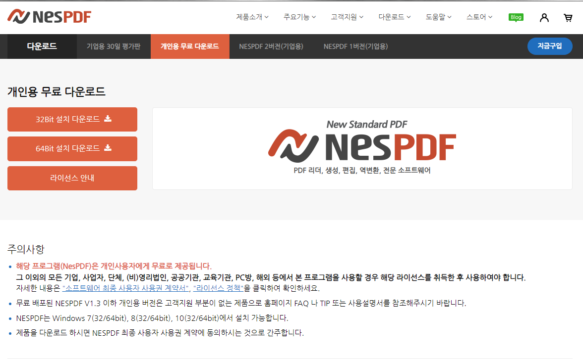 그러나 개인 사용자는 제한 없이 자유롭게 이용할 수 있으므로 걱정할 필요가 없습니다. NesPDF는 NesPDF사이트에서 다운로드할 수 있습니다. 다운로드 페이지에는 개인용과 기업용으로 나눠진 옵션이 있습니다. 개인용을 선택하여 설치하면 됩니다.