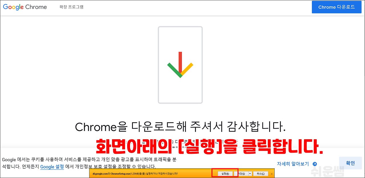 크롬 공식 사이트에서 설치 파일을 다운로드하여 PC에 저장합니다.